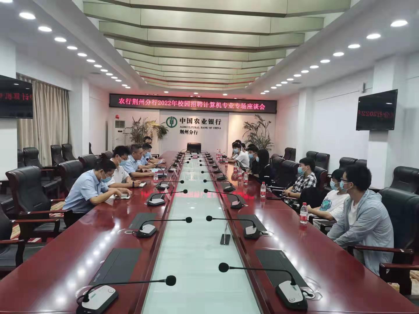 在座谈会上人力资源总经理梁红光就农业银行的历程以及员工晋升机制进行了介绍,荆州分行信息技术管理部总经理胡纲介绍了荆州分行的基本情况,以及本次的招聘情况,让同学们对农业银行荆州分行的企业文化及发展有更深刻的了解。计科院学子也针对本次招聘的形式、入职后的待遇、晋升机制进行了详尽的咨询。据悉,参与本次招聘共计研究生6名,本科生15名。梁红光总经理应届毕业生使公司的员工结构更趋向于年轻化、更具有创造力。本次招聘在荆州区、沙市区及下属地区支行都有相应的招聘需求,采取线下笔试(10月中旬),差异化面试的方式进行招聘。详情请关注中国农业银行人才招聘公众号。