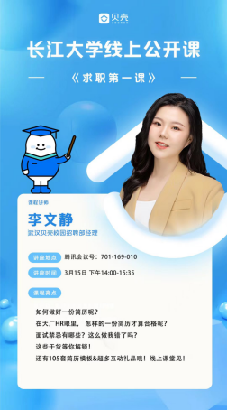 (通讯员 余珺瑞)2022年3月15日14:00,武汉贝壳找房科技有限公司校园招聘经理李文静受邀在腾讯会议为欧乐影院