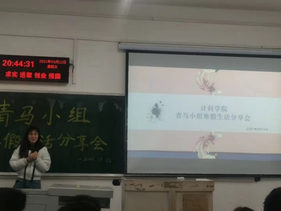 (通讯员 吕伟)“路漫漫其修远兮,吾将上下而求索。我将不忘初心,不负韶华,用自己的实际行动书写青马人无悔的青春……”3月12日晚7点,七教106教室里,不时传出一阵阵铿锵有力的誓词和雷鸣般的掌声,计科院青马小组以“不负韶华,筑梦青春”为主题的寒假社会实践活动分享会如期举行。出席这次会议的有辅导员张茜老师和计科院青马小组的14名成员,会议由辅导员张茜老师主持。
