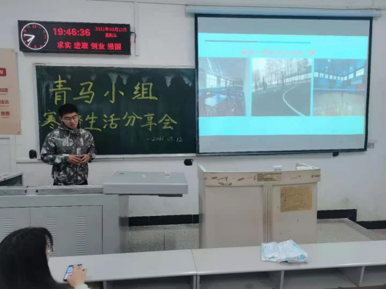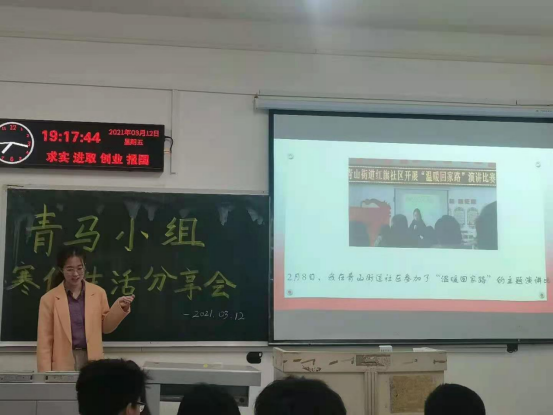 会议由三部分组成,首先是辅导员张茜老师做了简短的开场发言。接下来青马小组的成员依次对自己寒假社会实践的心路历程做了精彩的分享。他们一个个精神抖擞,侃侃而谈,辛勤的付出,丰硕的成果,精美的课件,精彩的演讲,令人动容。