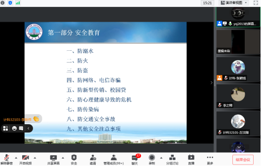 通讯员:张颖旭为切实做好常态化疫情防控下的2021年秋季新生开学教育工作,帮助和引导新生全面了解学校学院的整体防控工作2021822日晚19:00,欧乐影院 利用腾讯会议(分两个会场),召开以“梦想起航,安全至上”为主题的安全教育班会。参加此次会议的有欧乐影院 党委副书记颜学俊、21级辅导员张颖旭、兼职辅导员高小梅、新生班级班主任、21级全体新生及部分新生家长。