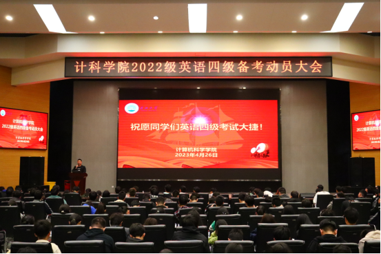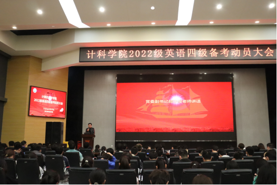在农科大楼1058报告厅举办2023年英语四级备考动员大会。会议由2022级辅导员郭帅主持,学院党委副书记颜学俊、外国语学院罗博老师、2022级全体本科生参加会议。