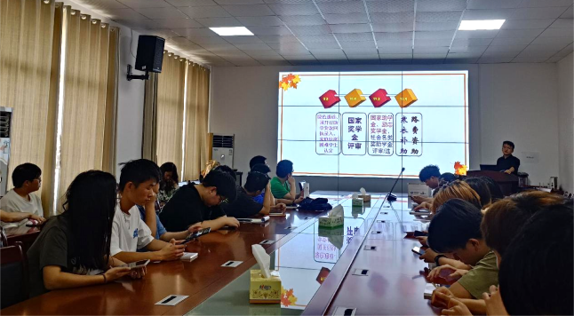 首先,张颖旭老师以习近平总书记在党的二十大报告中的“完善覆盖全学段学生资助体系”为引,向学生干部们介绍了学校开展学生资助工作的各项措施,简要讲述了欧乐影院