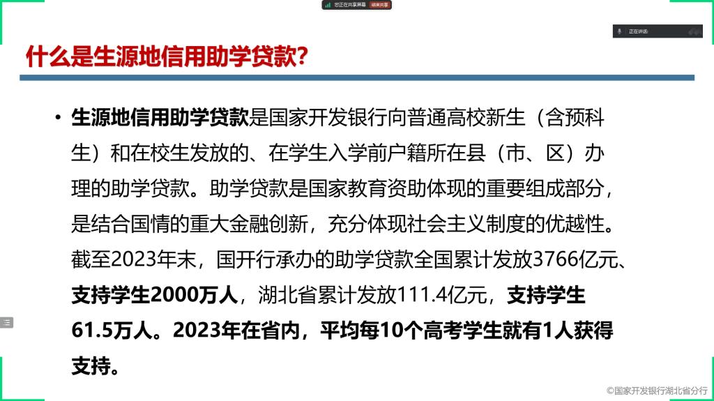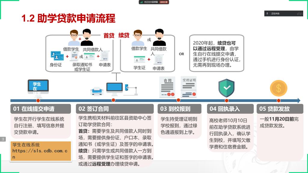 为深入贯彻落实国家资助政策,帮助家庭经济困难学生及家长全面了解生源地信用助学贷款相关事宜,确保家庭经济困难学生能够顺利入学并完成学业,欧乐影院 于9月15日在腾讯会议组织开展了2024-2025学年秋季学期生源地信用助学贷款政策宣讲活动。 活动伊始,学院负责资助工作的王鹏翔老师对生源地信用助学贷款政策进行了详细解读。围绕生源地信用助学贷款的申请条件、贷款额度、贷款期限、利息计算、还款方式以及申请流程等关键内容一一展开介绍。用通俗易懂的语言和生动具体的案例,深入浅出地为同学们答疑解惑,确保每一位在场同学都能清晰准确地理解政策细节。 除了对政策的宣讲与答疑,王鹏翔老师在活动中着重强调了资助育人的重要意义。指出生源地信用助学贷款不仅仅是一项经济援助政策,更是国家助力寒门学子实现梦想、成长成才的有力举措,希望同学们能够心怀感恩之心,珍惜来之不易的学习机会,在今后的学习生活中勤奋努力、积极进取,以优异的成绩回报国家和社会的关爱,将来也能够将这份爱心传递下去,去帮助更多有需要的人,真正将资助化作成长路上的动力,努力肩负起时代赋予的责任与使命。 此次生源地信用助学贷款政策宣讲活动,是欧乐影院 2024-2025学年秋季学期资助育人工作的重要一环,通过活动的开展,进一步加大了国家资助政策的宣传力度,使更多学生受益于生源地信用助学贷款政策,同时也在学生心中种下了感恩与担当的种子,为学院后续资助育人工作的深入推进奠定了坚实基础。