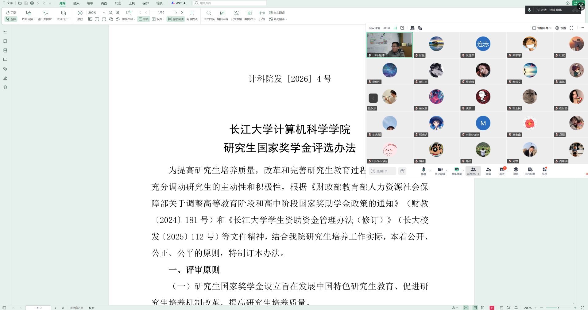 经过多轮研讨与学院学术委员会审议,近期对研究生学业奖学金、国家奖学金等相关重要文件进行了修订。为帮助全体研究生及时了解最新政策,学院于2月3日上午分年级组织召开线上研究生年级大会,由副院长詹炜主讲,党委副书记艾林、辅导员付盈出席会议。