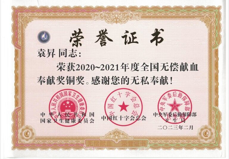 袁昇自高考结束后就开始参与到无偿献血的活动中。进入大学后,他响应祖国召唤,携笔从戎,为国防事业奉献了五年青春。即使是在疫情期间面临封控等困难,他也始终牢记“全心全意为人民服务”的宗旨,发扬雷锋精神,参与无偿献血。6年来,袁昇累计参加无偿献血13次,献血总量达5200ml。