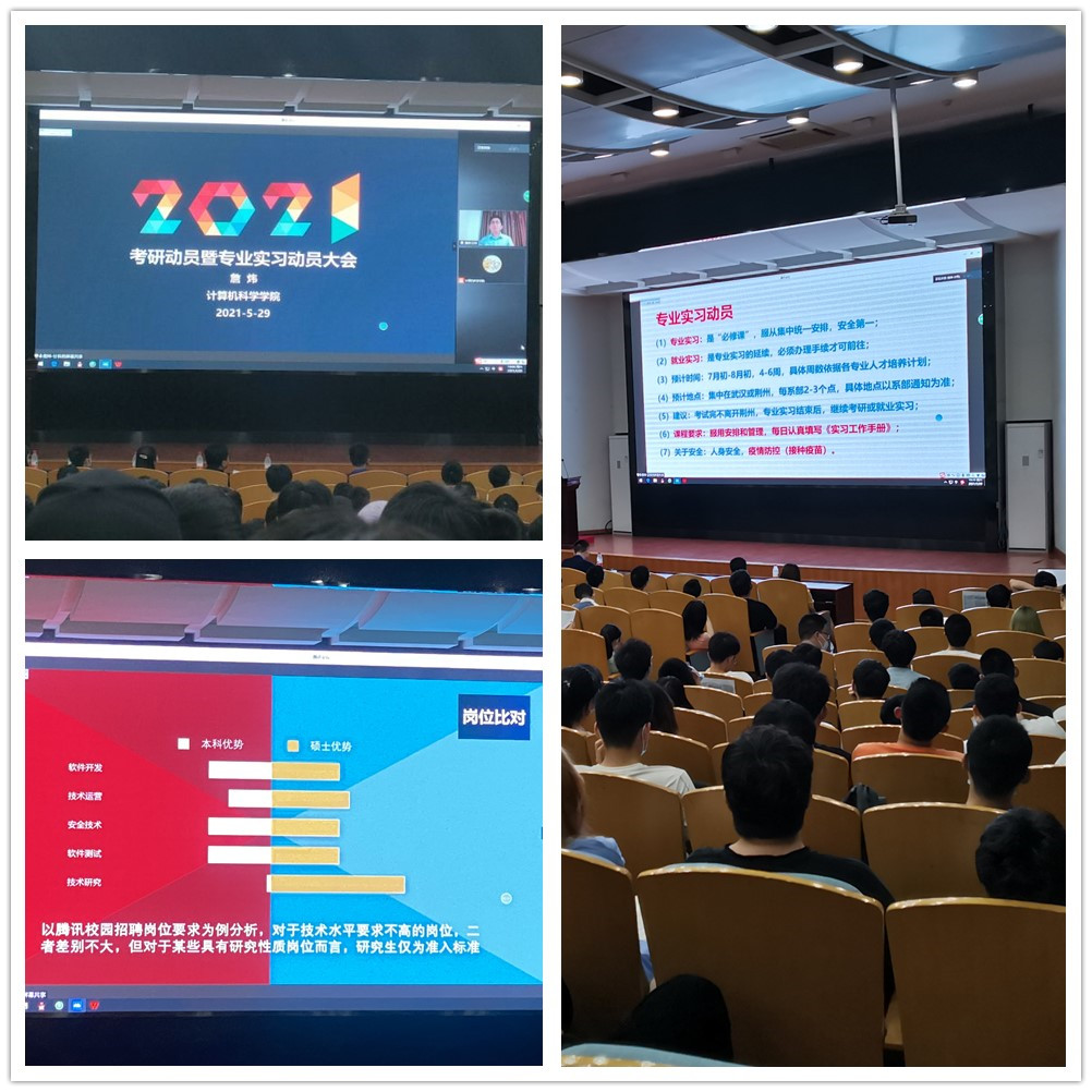 会议第一项,由学院分管教学工作的副院长詹炜做实习、考研动员。詹院长首先结合当下形势,对计算机大类专业毕业求职优势和国家对于创新性人才的需求进行了分析,鼓励大三学生认清形势后结合自身的情况去思考如何抉择就业和考研。同时结合近五年来全国研究生报考人数的情况和往年欧乐影院 毕业生报考研究生的情况,希望广大计科学子能够认清形势,脚踏实地,迎接战斗。接下来,詹院长说明了专业实习和就业实习的区别,并对欧乐影院 的专业实习工作安排进行了说明,特别强调了疫情防控形势下需要注意的人身安全问题。
