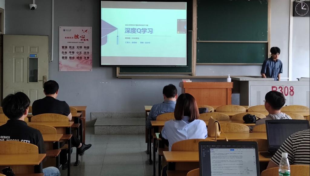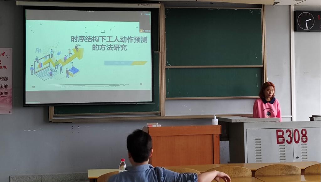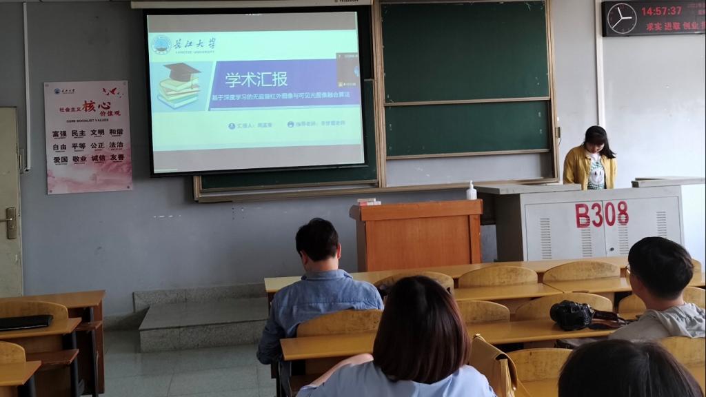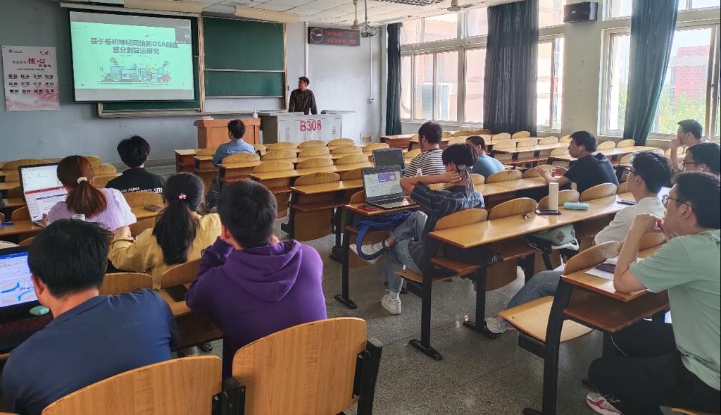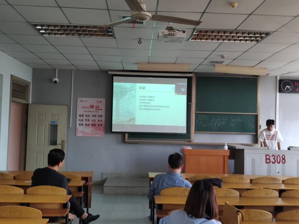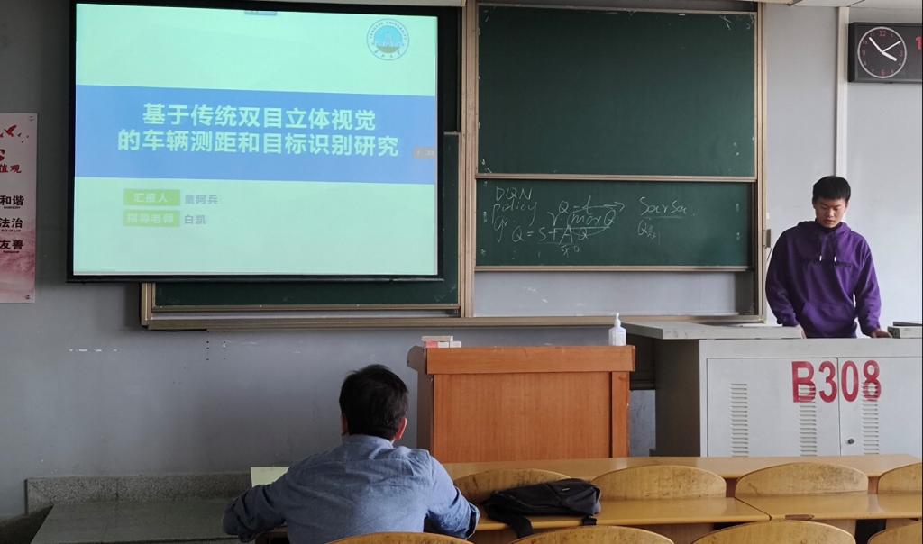 9位研究生依次登台演讲,分别围绕各自的研究方向,为同学们分享了9个课题:基于属性加权朴素贝叶斯算法的OTSU图像分割方法,基于深度学习的无监督红外图像与可见光图像融合算法,深度Q学习-DQN算法原理,基于Bp神经网络的乳腺癌候选药选择,改进蚁群算法在路径优化中的应用,基于GAN~LSTM的连续管振动分析,基于传统双目立体视觉的车辆测距和目标识别研究,基于卷积神经网络的DSA脑血管分割算法研究,时序结构下工人动作预测的方法研究等内容。学术论文报告会已经成为同学们知识共享和传播的一种重要方式,在演讲过程中,导师与听众和演讲人针对相关研究成果互动、探讨。每名研究生演讲完后,四位导师从多角度对演讲学生的汇报进行仔细点评,对其研究内容可能遇到的科研困难进行指导,通过点评有效促进了研究生的成长。