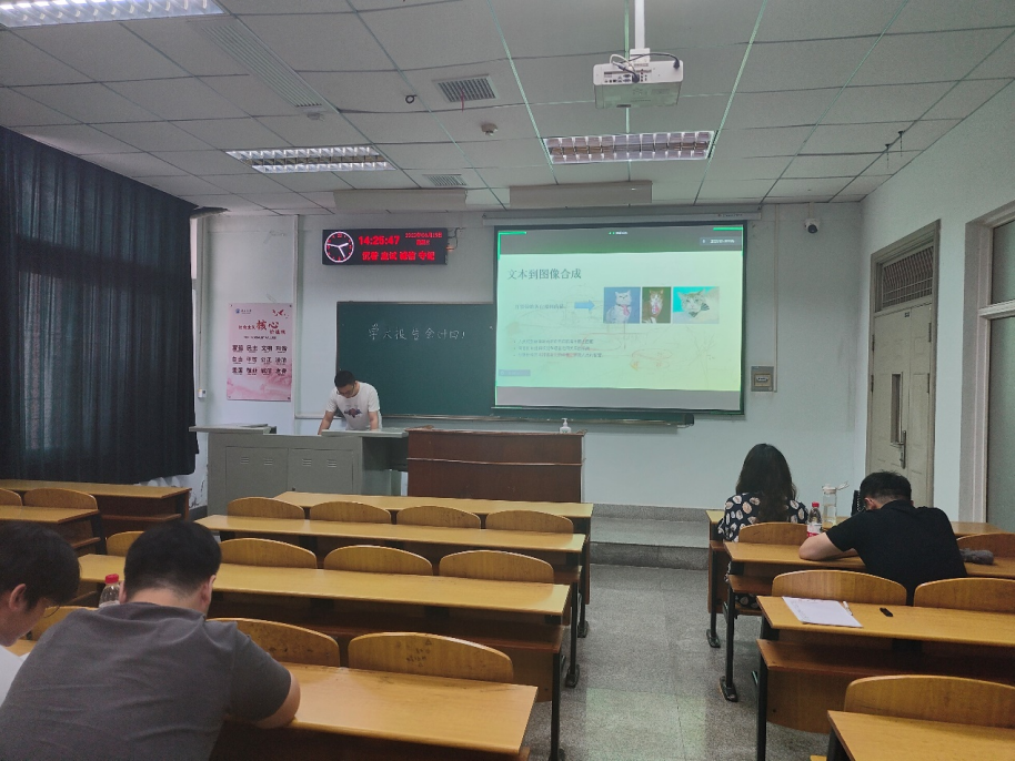 9位研究生依次登台演讲,分别围绕各自的研究方向,为同学们分享了9个课题:硬盘诊断技术研究、基于VQ-Diffusion的文本到图像合成、基于YOLOv5的目标检测研究、基于YOLOv5和DeepSort的目标识别及追踪、基于MapReduce的股票数据聚类分析、图卷积神经网络及应用、深度强化学习在移动边缘计算的任务卸载研究、基于知识图谱的问答系统、基于YOLOv5的大豆豆荚和茎秆的识别等内容。学术论文报告会已经成为同学们知识共享和传播的一种重要方式,在演讲过程中,两位导师与听众和演讲人针对相关研究成果互动、探讨。每名研究生演讲完后,两位导师都从更加深入的角度对演讲学生的汇报进行仔细点评,对其研究内容的下一步行动进行了探究,通过点评有效促进了研究生的成长。