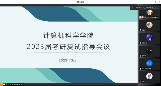 最后,2019级年级辅导员张茜老师鼓励大家在准备复试的同时积极关注年级就业相关信息,考研工作两不误,要脚踏实地,从自身出发,尽量做到一次上岸。学院党委副书记颜学俊对复试准备、注意事项、调剂等方面进行了简要总结,强调了时代背景下复合型人才的重要性,鼓励学院学子在交叉学科也能发光发热,并预祝大家复试成功,全部上岸。