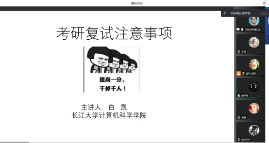 线上召开了考研复试指导交流会。本次会议由学院党委副书记颜学俊主持,地物学院副院长赵彬、油工学院副院长李忠慧副、计科学院软件工程系主任王同喜、物联网工程系白凯、2019级辅导员张茜以及本院一百余名备战研究生复试的毕业生参加了本次会议。