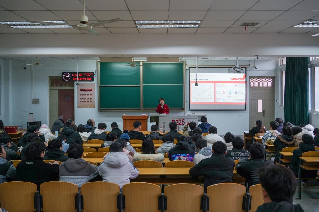 院长崔艳荣在13教D225以《中国经济“形”稳“势”升》为题作形势与政策报告,学院本科生150余人参会。