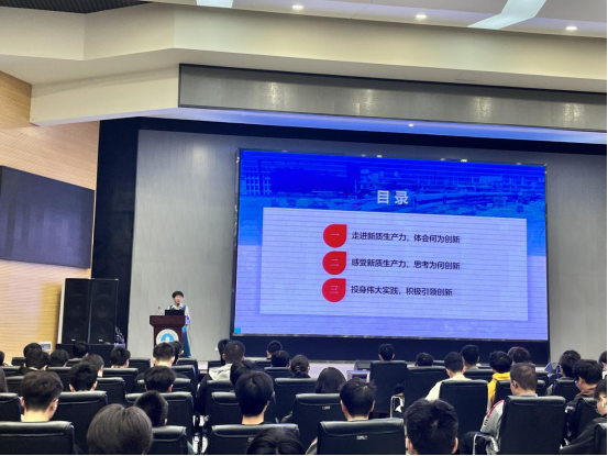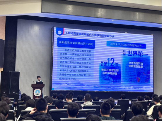 院长崔艳荣以此为切入点,首先向同学们阐述了新质生产力的由来、基本内涵和本质特点,并列举了以“5G+北斗”、自主超导量子计算机等新质生产力的代表。然后,崔院长从发展新质生产力是推动高质量发展的内在要求和重要着力点等5个方面详细讲解了国家为何要大力发展新质生产力。最后,崔院长鼓励同学们胸怀“国之大者”,增强以新质生产力发展推动强国建设、民族复兴的使命感责任感,并且要强化创新创业能力培养,在夯实专业理论的基础上激发创造热情、增强创业本领。