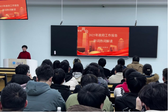 院长崔艳荣在东校区16教B106以《2025年政府工作报告新词热词解读》为题作形势政策报告,学院2024级全体研究生参加了此次会议。