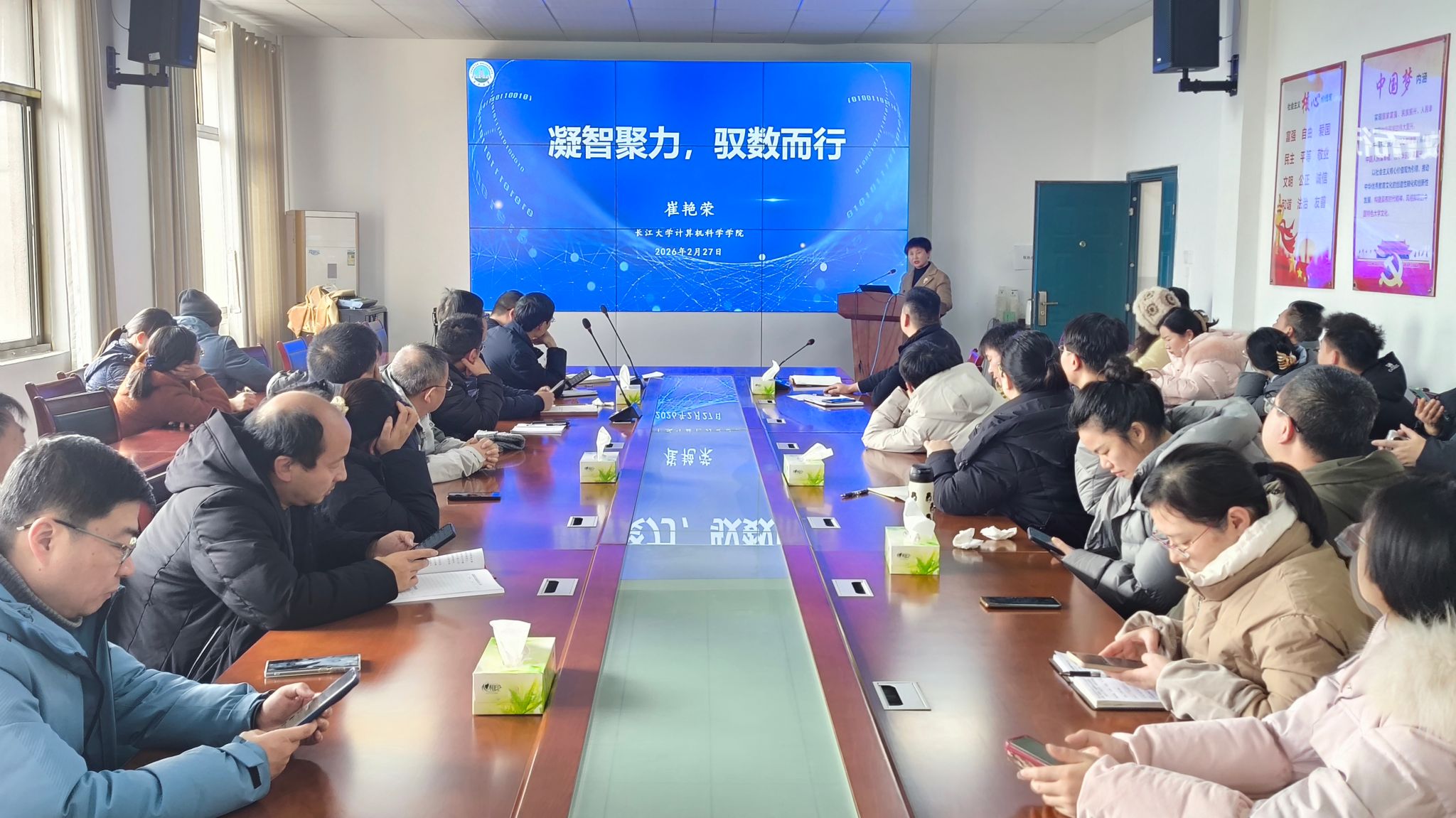 在5教501会议室召开2026年新学期工作部署会,会议由学院党委书记郑健主持,全体教职工参加。