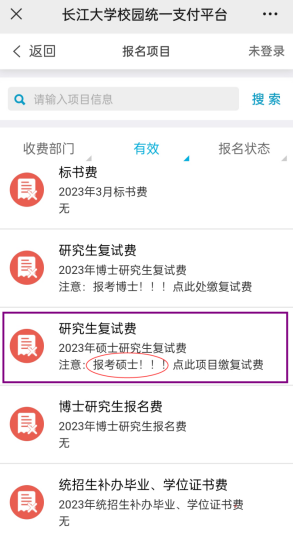 3、 点击“报名项目”后,选择“2023年硕士研究生复试费”: