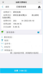 5、基础信息填写完后,务必在“学院备注”栏中正确选择参加复试的学院(参加附属第一医院复试的考生选择“第一临床医学院(附属第一医院)”、参加附属荆州医院复试的考生选择“第二临床医学院(附属荆州医院)”),最后点击“交费”即可。