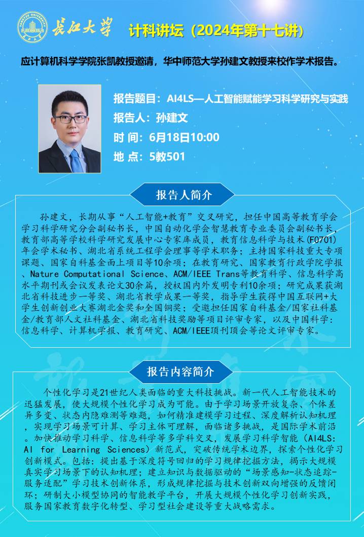 计科讲坛(2024年第十七讲):AI4LS—人工智能赋能学习科学研究与实践