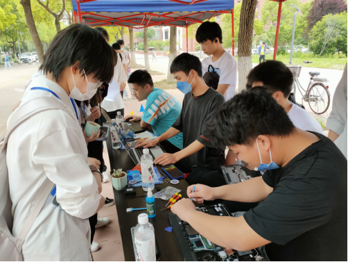 本次开幕式现场分为四个区域,分别是志愿活动区、游戏区、领奖区和计算机知识图文展。在志愿活动区有志愿者帮助同学清灰及重装系统筹优化电脑的义务活动,由欧乐影院