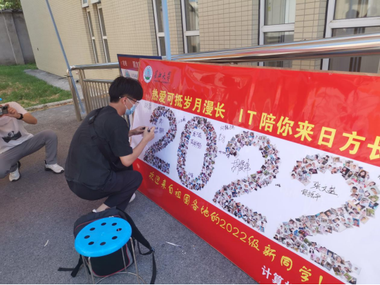 用500多张新生照片组成的“2022”字样的签名墙,异常醒目,新生纷纷寻找自己的靓影签名并合影留念。