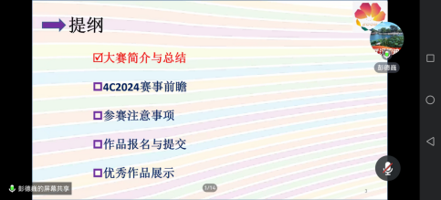 彭德巍,中国大学生计算机设计大赛中南地区赛组委会执行委员,现任武汉理工大学计算机与人工智能学院副教授湖北省人工智能学会理事,主要从事人工智能、移动计算等领域的研究与教学工作。长期担任各类科竞赛评审专家,具有丰富的大赛指导经验本次讲座,彭教授主要从大赛简介与总结、4C2024赛事前瞻、参赛注意事项、作品报名与提交、优秀作品展示等五个方面进行了详细讲解。在4C2024赛事前瞻上,彭教授着重强调,今年赛事与往年相比有改动,有些赛道的类别进行了优化。同时,在参赛注意事项上,彭教授从报名比赛的资料填写、参赛过程的素材准备到现场答辩形式,从校赛到省赛再到国赛,事无巨细的给同学们进行了详细的讲解。在会议尾声,彭教授展示出往届许多优秀作品供学生们参考。在最后的答疑环节,针对同学们提出的各项疑问,彭教授也一一做了详细讲解。